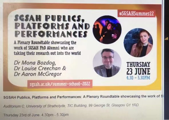 (一)2022623-24日苏格兰艺术与人文研究生协会年会 线上 该会议系英国苏格兰研究生协会艺术与人文分会2022年年会。会议集中展现了苏格兰艺术与人文研究生研究中主要成果。邢丹同志参加了此次会议并在分组讨论中进行了积极讨论与互动