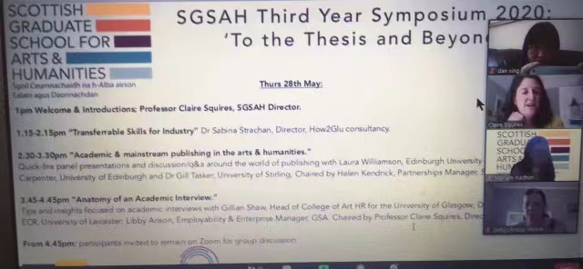 (二)2020528-29日苏格兰艺术与人文研究生协会三年级研究生专题调研会线上 该会议系英国苏格兰研究生协会艺术与人文分会针对三年级博士研究生研究方法进行的专业培训与成果交流。会议集中培训并展示苏格兰艺术与人文研究中使用的主要研究方法如个案研究、行动研究、田野研究和民族志研究方法。同时该会议对优秀研究方法个案及其主要成果进行了展示、交流和讨论。邢丹同志认真学习了主要研究方法,并在分组讨论中进行了积极讨论与互动。