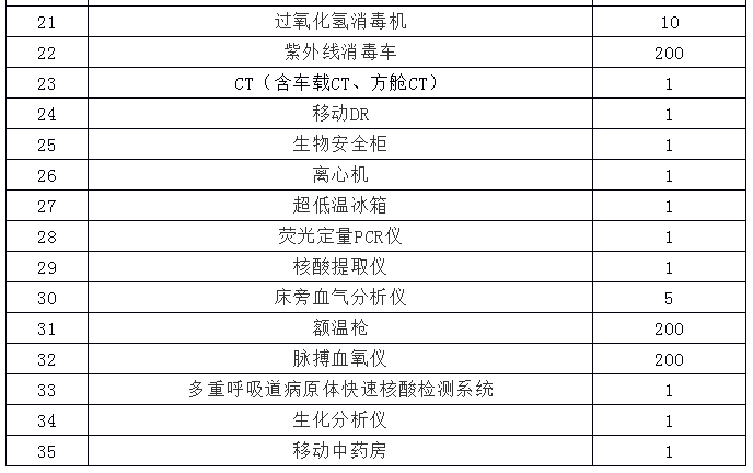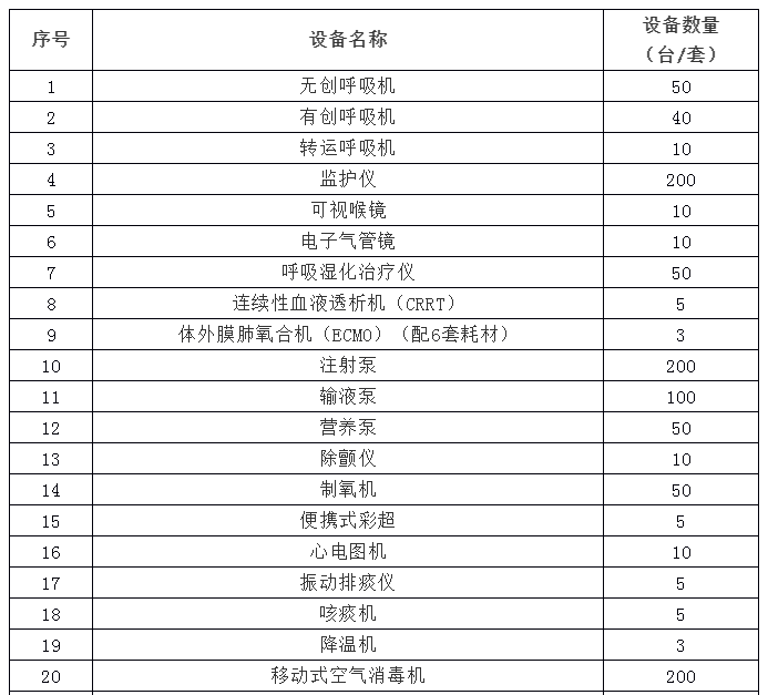 建设内容 一是加强重症监护病区(ICU)建设。原则上按照医院编制床位的10-15%(或不少于200张)设置重症监护病床,设置一定数量负压病房和负压手术室,按不同规模和功能配置心肺复苏、呼吸机、体外膜肺氧合(ECMO)等必要的医疗设备。二是建设可转换病区,按照“平战结合”要求,改造现有病区和影像检查用房,能在战时状态下达到三区两通道的防护要求,水电气按照重症集中收治中心要求进行改造。三是改善呼吸、感染等专科设施条件。鼓励设置独立的病区或院区,重点加强检验、发热门诊等业务用房建设,按医院床位的2-3%设置门急诊观察床,按需要建设科研、教学用房,加强血液保障能力建设,配备相关设备,加强专业人才队伍建设和能力培训。四是提升公共卫生检验检测、科研和紧急医学救援能力。整合医院现有资源,结合实际工作需要,建设达到生物安全二级或三级水平的实验室、聚合酶链式反应(PCR)实验室、传染病解剖室等。加强紧急医学救援快速反应装备配置。五是加强应急救治物资储备。储备一定数量的重症患者救治、普通患者监护、方舱医院设备等方面物资(详见附件)。“平时”满足医院正常使用需求,“战时”服从国家统一调度。科学确定储备规模和设备品类,提升有效抵御第一波需求冲击的能力,为后续生产供应赢得宝贵时间。六是支持有条件的中医机构建设达到生物安全二级或三级水平的实验室,健全完善中医药应对突发公共卫生事件科研支撑平台。