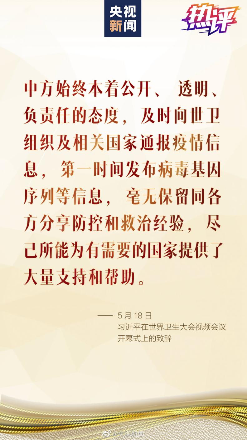 习近平主席在致辞中高度凝练地概括了中国的抗疫作为。其中讲到,“中方始终本着公开、透明、负责任的态度,及时向世卫组织及相关国家通报疫情信息,第一时间发布病毒基因序列等信息,毫无保留同各方分享防控和救治经验,尽己所能为有需要的国家提供了大量支持和帮助。”