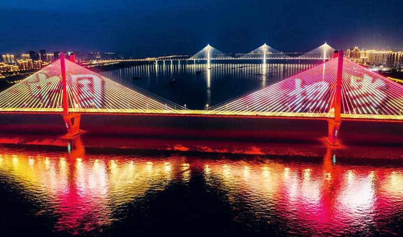 在抗击新冠肺炎疫情的斗争中,中国人民万众一心、众志成城,凝聚起强大合力,展现了中国力量、中国精神、中国效率。图为2020年5月2日晚,湖北武汉长江二桥灯光秀打出的“中国担当”画面。中新社发 赵广亮/摄
