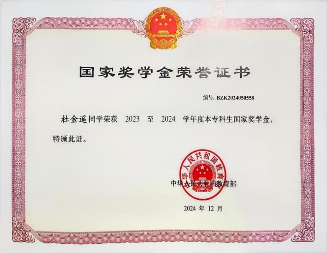 她勤奋刻苦,求知欲强,独创“三段式学习法”;课前预习思维导图,课堂实时问答互动,课后疑问深探究。四年以来,她成绩名列前茅,并以专业前5%的成绩于2024年12月获得国家奖学金。并如愿考入了她理想的院校延边大学。“不止于前,不止于此。”未来她也将会以谦逊的态度不断学习,扎实基础,争取取得更加优异的成绩。