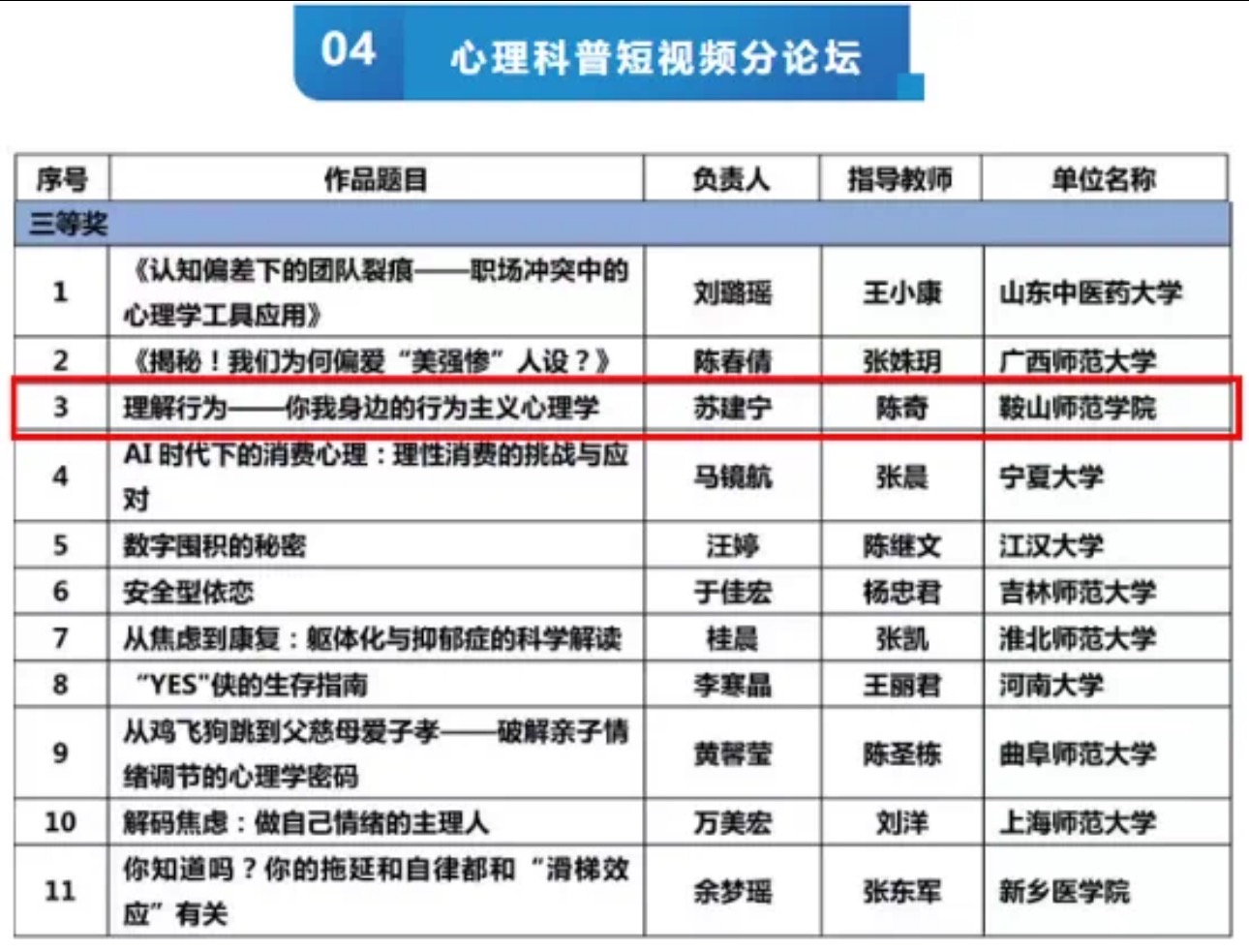 2025年4月28日,由教育部高等学校心理学类专业教学指导委员会主办的“2025全国高校心理学专业本科生创新创业论坛”发布评审结果。教育科学与技术学院应用心理学专业陈奇老师所指导的苏建宁同学设计的作品——《理解行为——你我身边的行为主义心理学》,在决赛中荣获“心理科普短视频分论坛”三等奖。