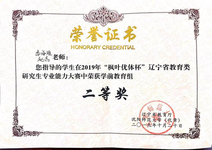 2.2019年指导学生于“枫叶优体杯”辽宁省教育类研究生专业能力大赛中荣获学前教育组二等奖