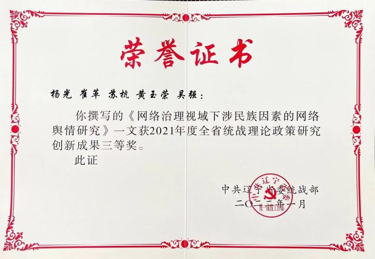 6.在2022年荣获2021年度全省统战理论政策研究创新成果三等奖。