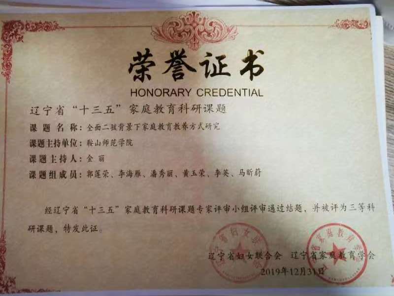 4.在2019年辽宁省“十三五”家庭教育科研课题荣获三等奖。